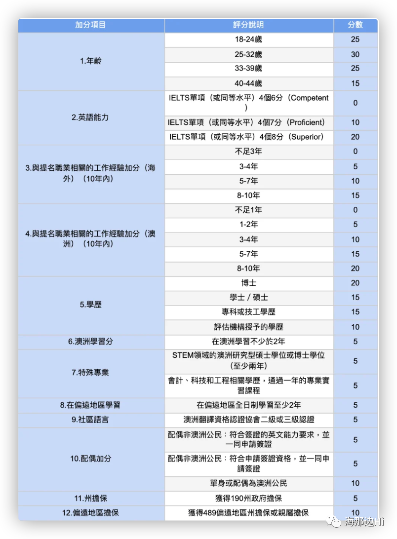 大家应该也了解,澳洲技术移民采取的是打分制,独立技术移民需要达到65分,其他的州担保或者偏远地区的技术移民则可以放宽。下面这个是打分表,大家可以对号入座,看看自己能有多少分。