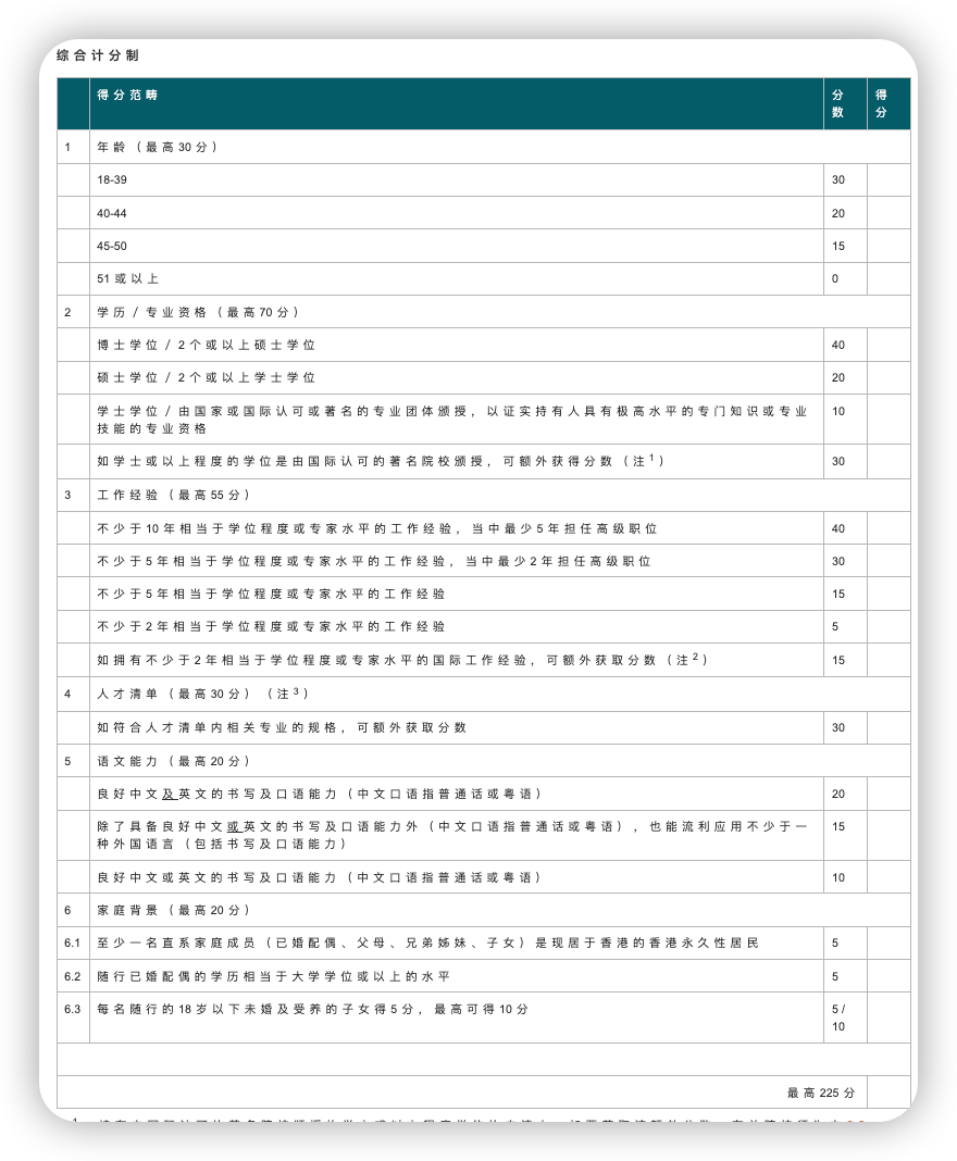 下面这个就是香港优才的打分表,大家可以先给自己打个分。一般来说80分及格,满足100分以上申请的话更有把握。