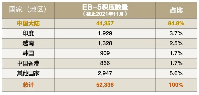 截至2021年11月,美国移民局总共积压了52366件投资移民的申请,其中来自中国大陆地区的就有44357件,占到总人数的84.8%。也就是说,有44357个中国人交了至少50万美元(最近两年涨价到80-90万美元),正在排队等着,而这笔钱,很有可能已经交了5、6年了。