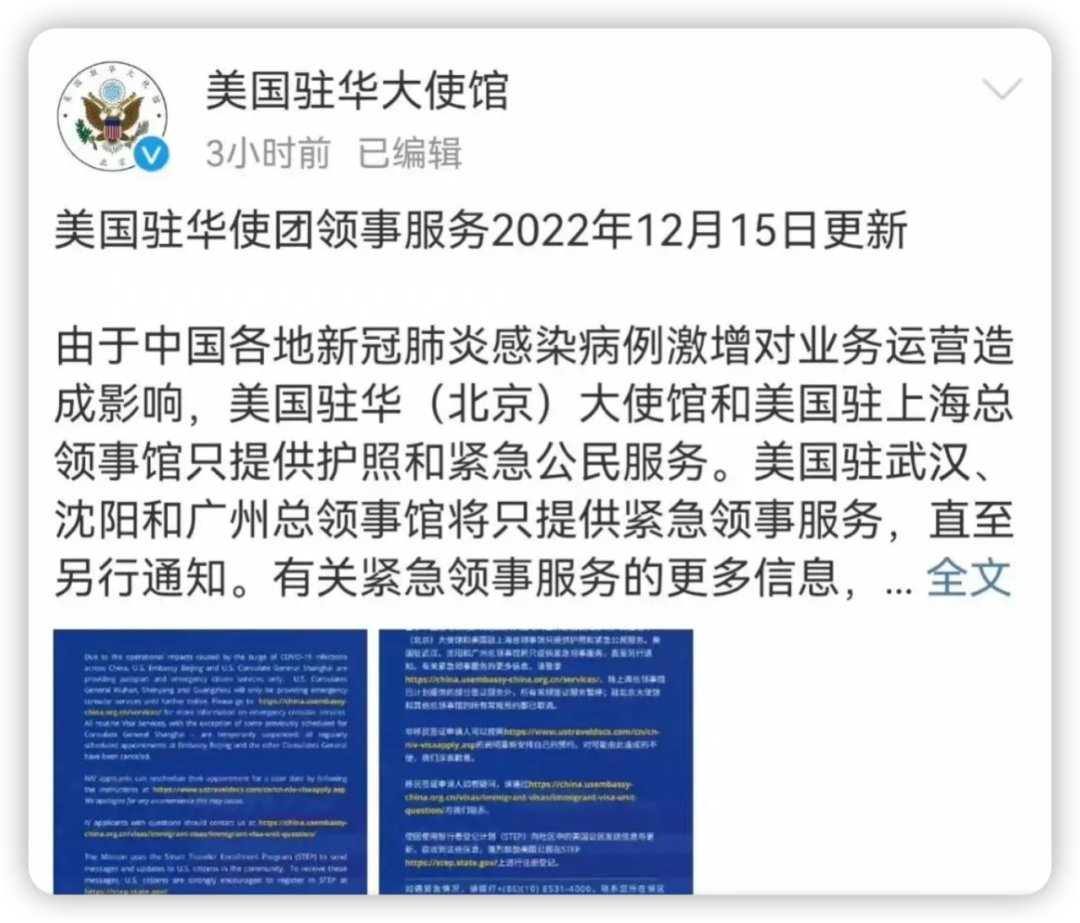 首先带头的还是美国,美驻华大使馆官方微博发了一则通知:自12月12日起,北京、广州、上海和沈阳进行了常规签证预约的,非移民签证申请者需要重新预约时间,12月线下面试取消。移民签证预约保持不变。