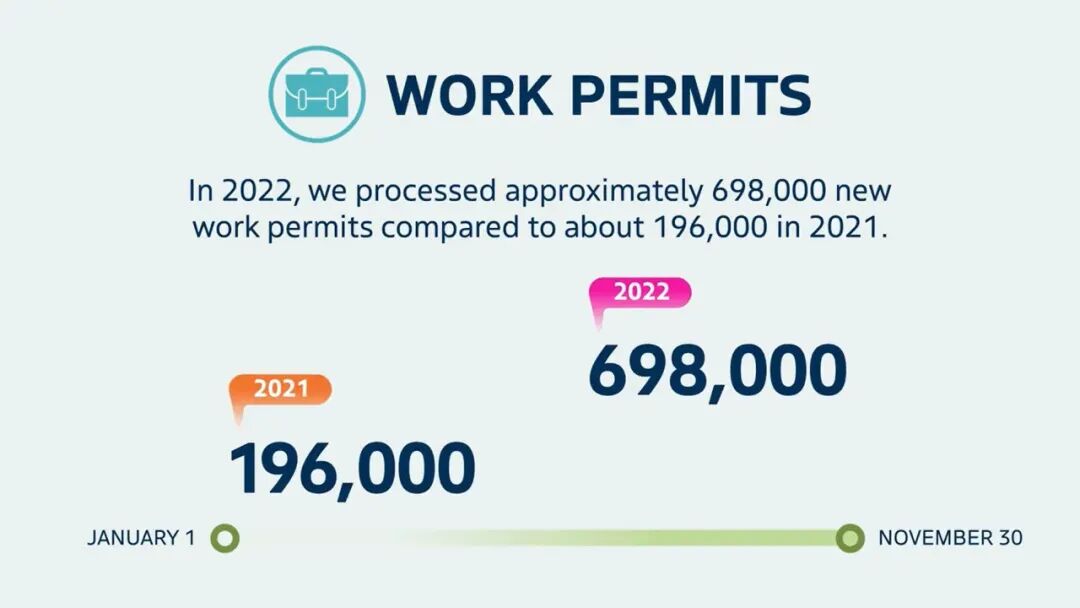 2022年,联邦政府还采取了许多新措施,帮助加拿大工商业雇用临时工人和永久居留的新移民。截至2022年11月30日,全年已审理了近70万份工作许可,而在2019年的同一时期,在疫情大流行之前,大约只有22.3万份。