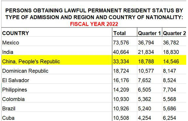 中国连续两年成为美国第三大移民输出国,与2021年上半财年16,209人相比,同比暴增106%。