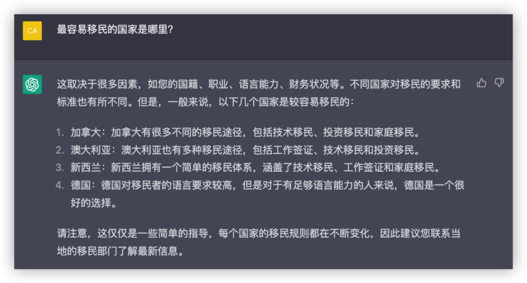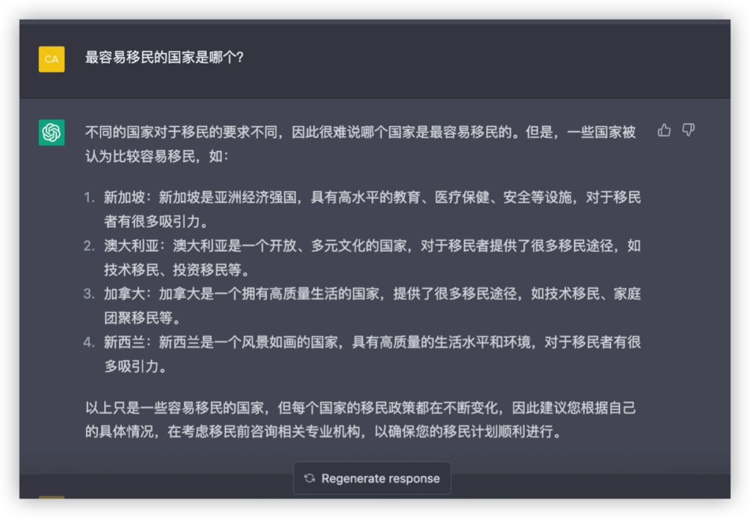 总之,ChatGPT给出的这三个答案,并没有让我很满意,另外我还发现了一个问题,就是它并不能针对个人情况给出详细的移民申请指导,只是笼统的提到了技术移民、投资移民和家庭团聚移民。