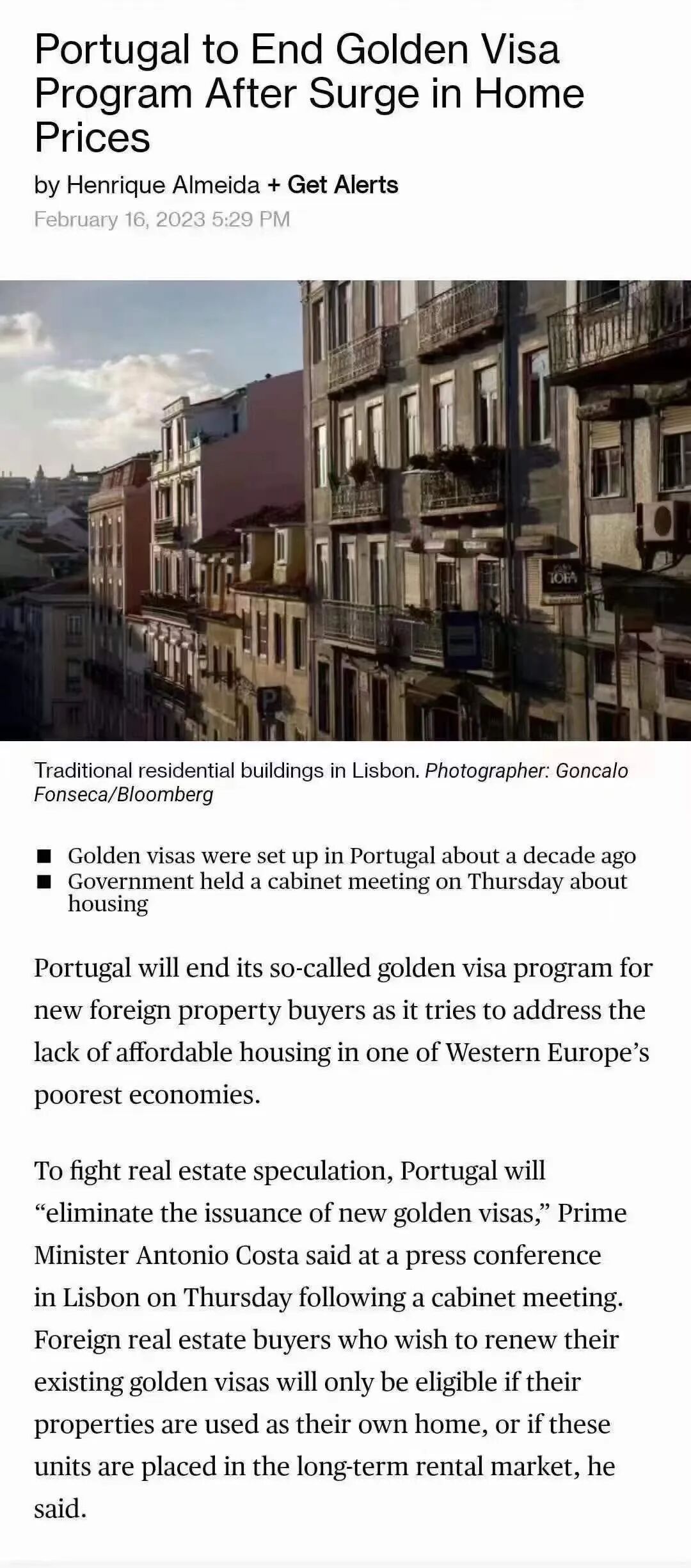 在爱尔兰宣布彻底关停投资移民计划不久之后,葡萄牙也宣布,将不再发放“黄金签证”,政策修改的具体细则将在3月16日公布。
