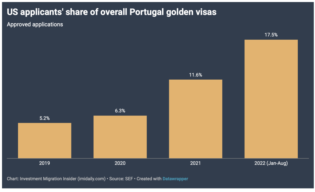 根据葡萄牙移民局发布的2022年数据,当年度美国人黄金签证的申请占了总申请量的17.5%,是近两年来增长最快的国家之一。