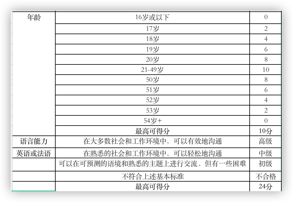 我们可以看到,这个评分表只要你在两个方面比较突出就能达标,并没有硬性的语言和学历的要求。