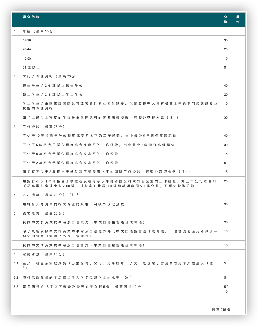 下面这张是香港优才计划的评分表,满分是245分,达到80分及格,大家可以自行评估一下。