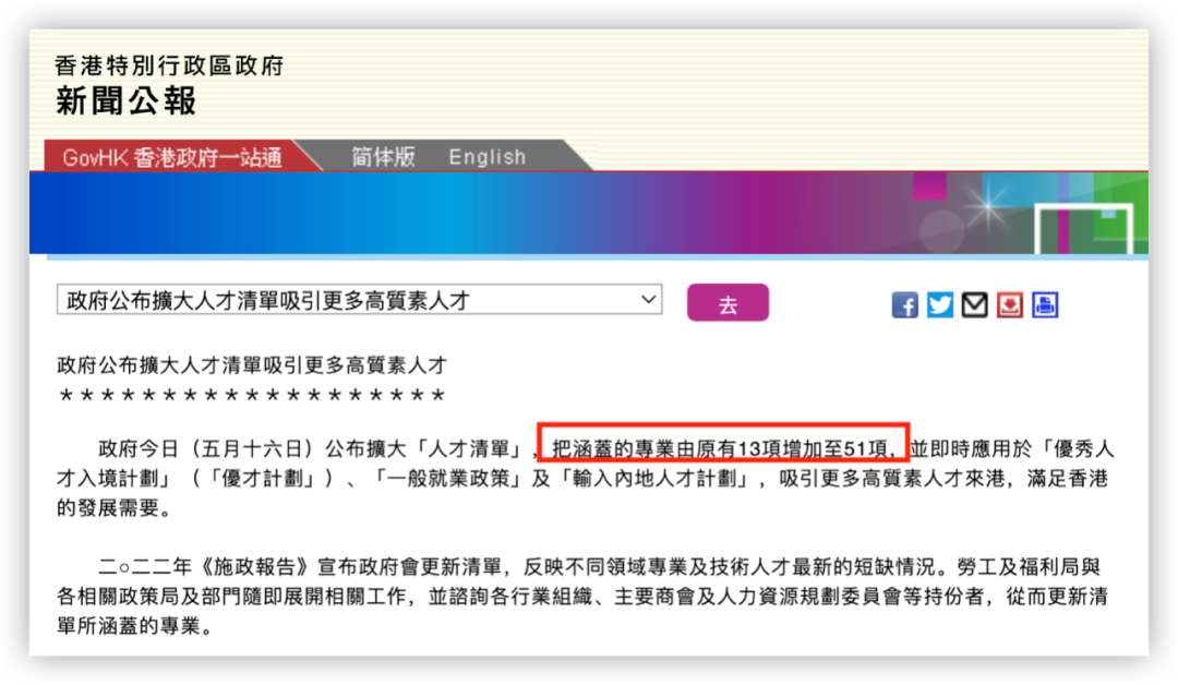 中国香港政府今天公布了一个好消息,将“优才计划”的人才清单从13个扩招至51个。