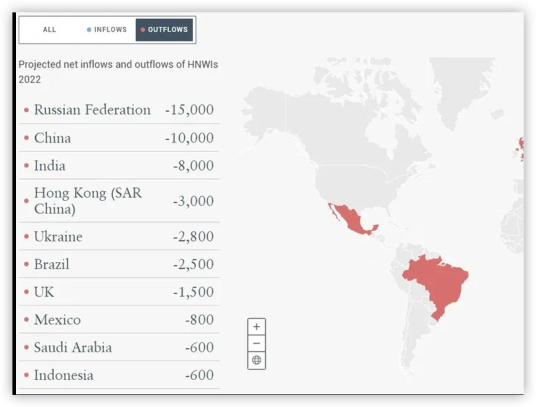 其中俄罗斯富豪的移民数量最高,一共有1.5万名富豪移民,占富裕阶层的15%。估计随着今年俄罗斯越来越孤立无援的境遇来看,这个数据还会源源不断增加。