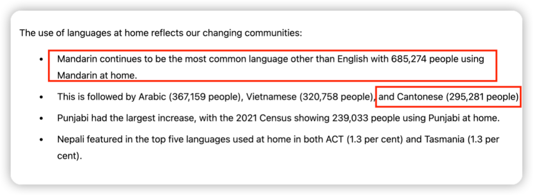 2022年6月28日,澳洲统计局(ABS)发布了最新一次人口普查报告,统计了澳洲人最常说的语言,除了英语之外,中文成为了澳洲第二大语言。