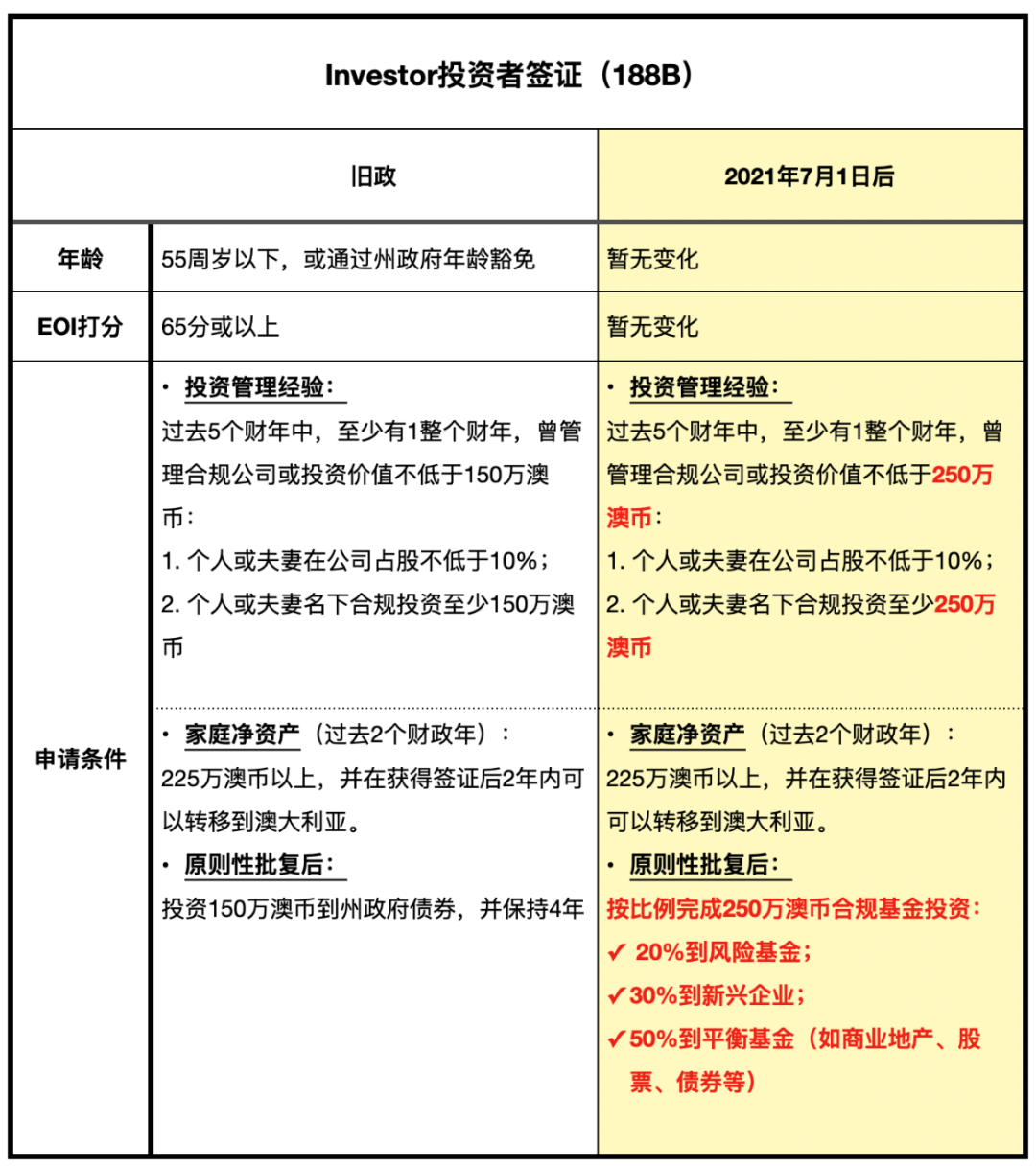 这个签证类别下面有188B和188C,都在2021年7月之后进行了新政改革,一个需要投资250万澳币和通过EOI(商业打分),一个无需商业打分但需要投资500万澳币。