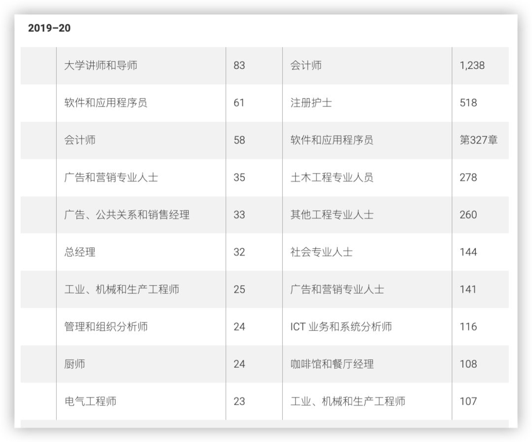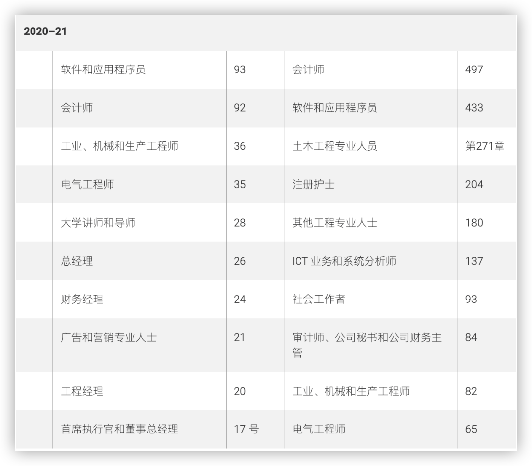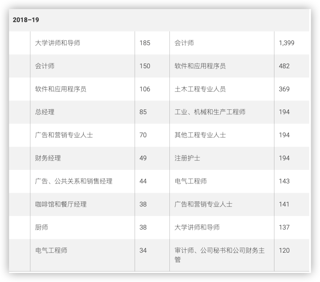 可以看到中国人最喜欢通过会计师移民,除此之外是护理、程序员、工程师等。不过会计师的移民数量也是逐年递减,这与越来越卷的技术移民环境有关。