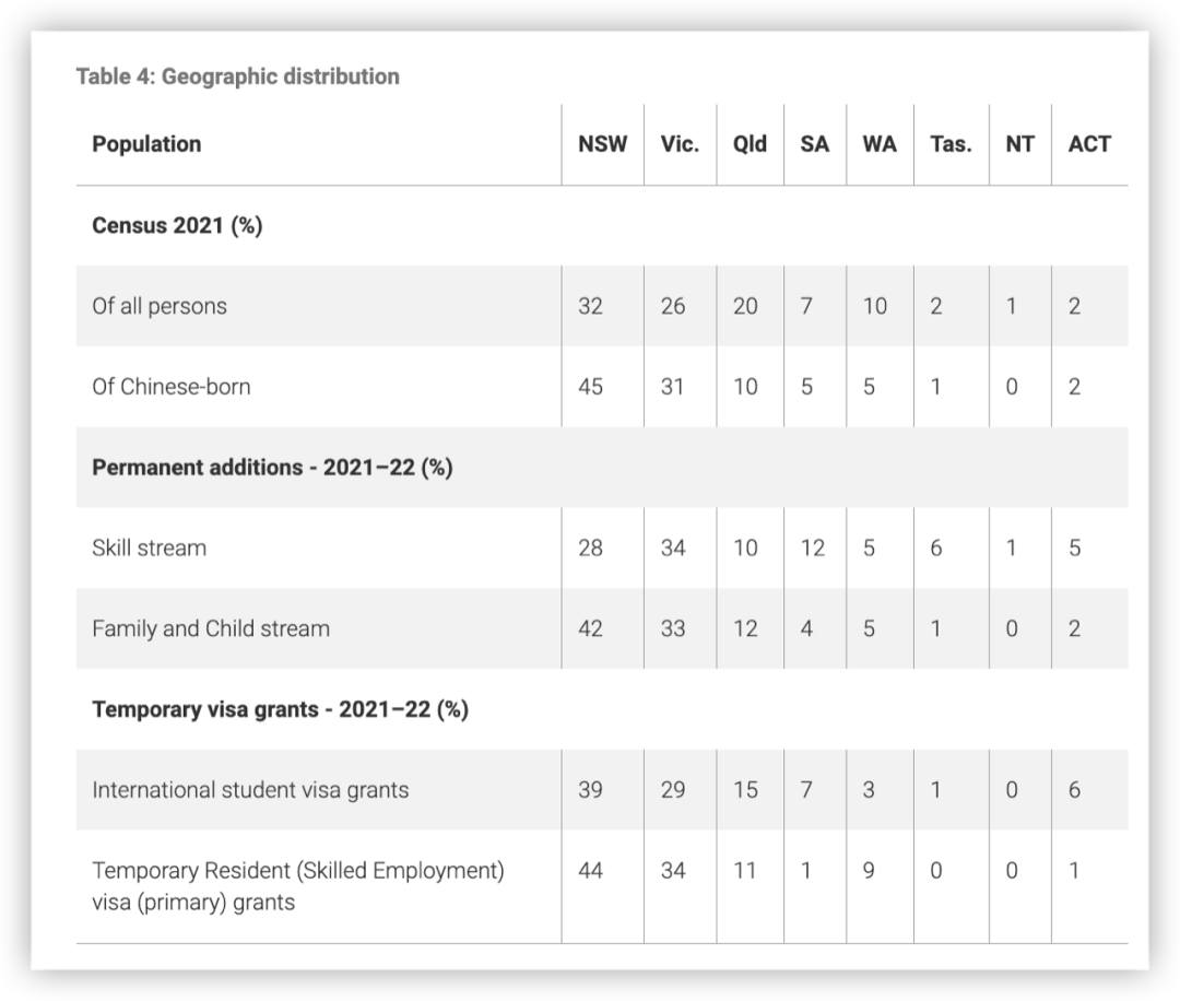 中国移民都喜欢住在澳洲的哪里呢?下面这张表一目了然。中国大陆的移民更喜欢呆在新州、维州和昆州。