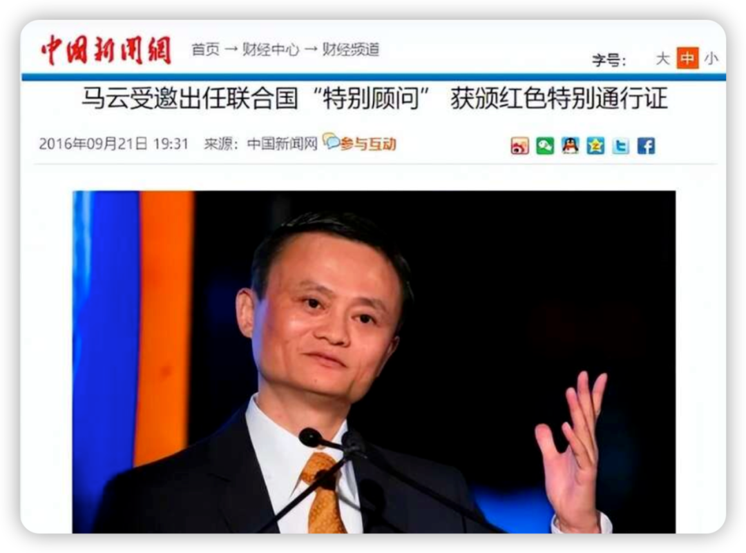 2016年,马云被聘为联合国贸易和发展会议青年创业和小企业特别顾问,年薪一美元,不管五险一金和社保。