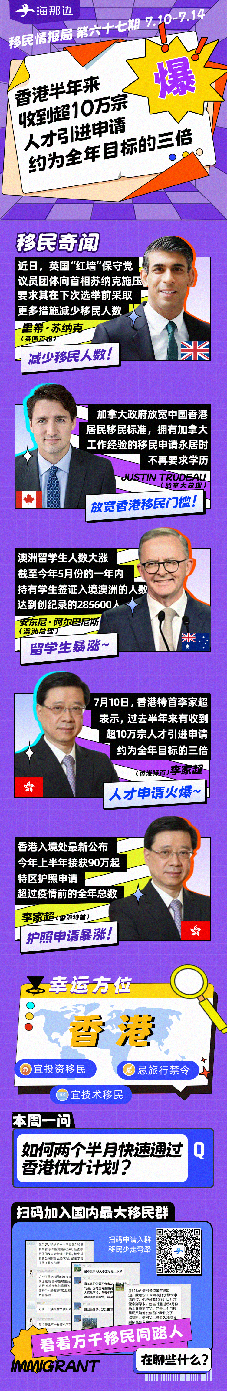 香港半年收到10万宗移民申请;澳洲留学生数量创纪录;加拿大放宽移民门槛