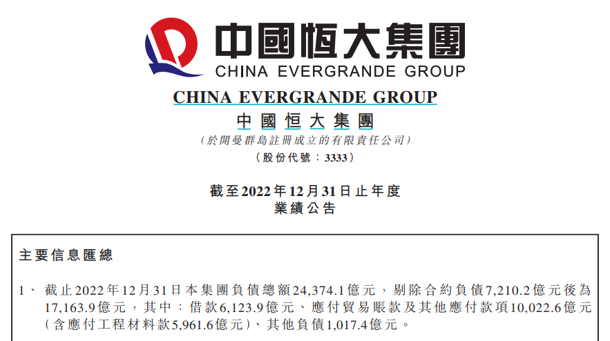 财报显示,恒大集团2021和2022年净亏损合计超8000亿元。截至2022年12月31日,恒大集团总负债超2.4万亿元。