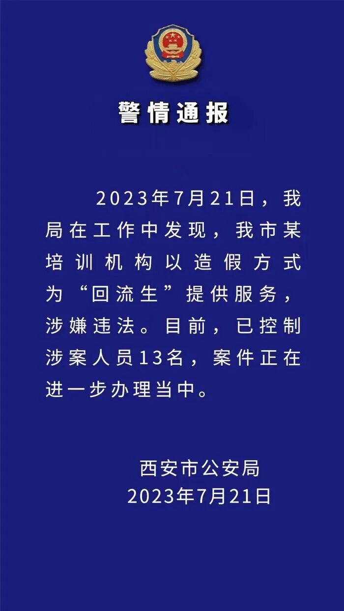7月21日晚,西安市公安局发布警情通报,称发现该市某培训机构以造假方式为“回流生”提供服务,涉嫌违法。目前,已控制涉案人员13名,案件正在进一步办理当中。