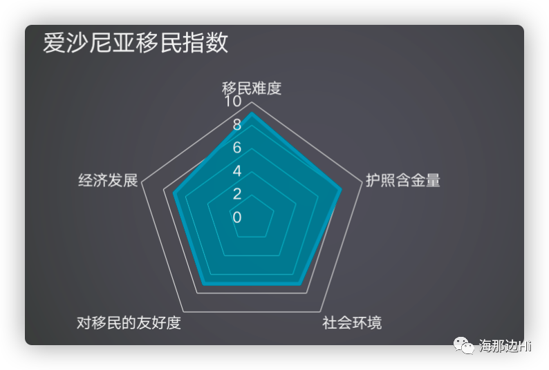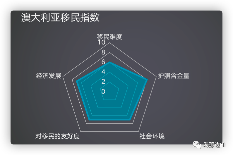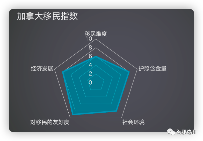 这5个维度分别为:移民难度;护照含金量;社会环境;对移民的友好度;经济发展。(每个维度的满分为10分)。