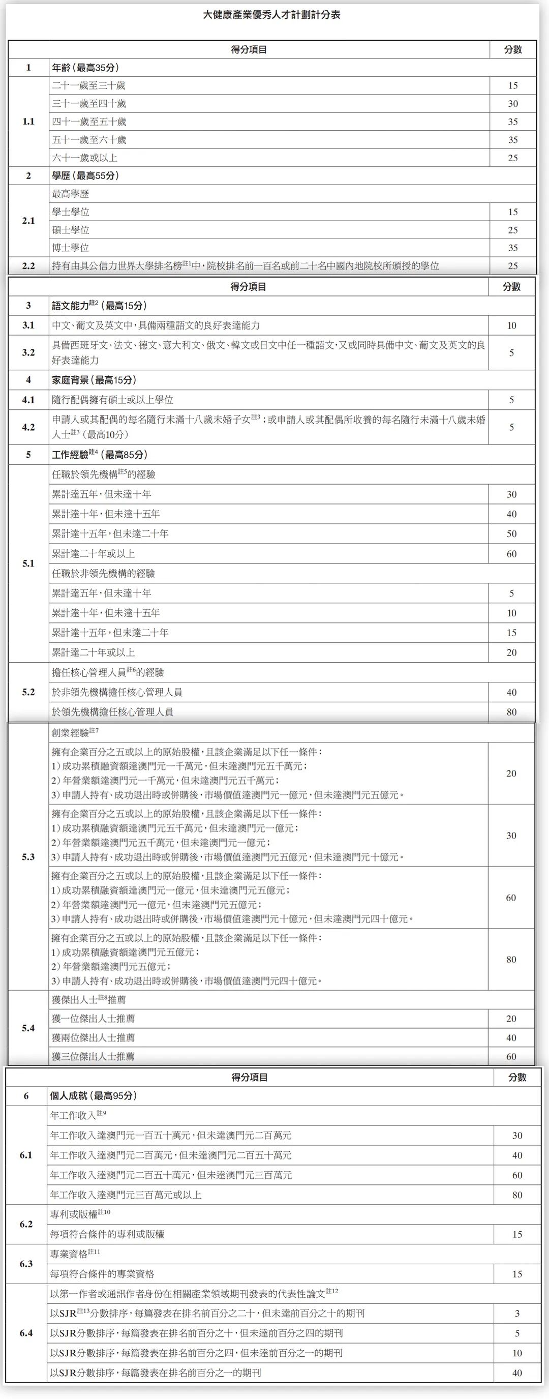 7月31日,澳门特区政府发布了大健康类人才的评分表,总分300分,其中优才申请人需满足最低要求200分,专才需满足最低要求150分。