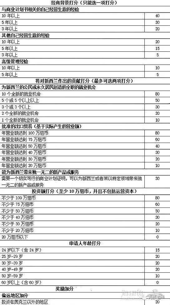 在新西兰诸多的移民政策中,有一个在投资门槛上最低的项目,那就是普通类创业移民。因为这个项目对于投资金额的要求很低,只需要投资10万纽币(相当于45万人民币左右)就可以申请了。当然,之所以把投资金额的门槛设置这么低,是因为新西兰移民局看重的不是投资,而是申请者的商业素质,能否在新西兰成功创建一门生意,味哦新西兰的经济发展作出贡献。因为这个项目还有其他要求,比如:1. 主申请人拥有经商管理经验(5年高管经验/3年持股25%以上股东经验)。2. 向移民局递交商业计划书及移民申请,并依照商业计划投资最低10万纽币创业,须解释投资款的合法来源。3. 综合评分满足120分。4. 英语雅思平均4分(G类)。下面是新西兰创业移民的打分表,大家可以对号入座看看是否能达到120分。