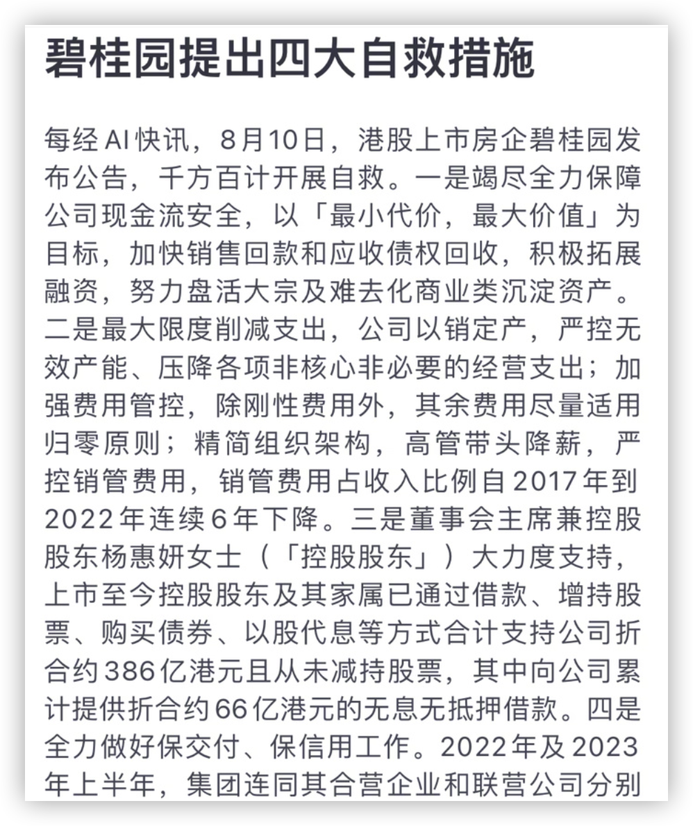 8月10日,碧桂园在港交所公告,预期上半年度净亏损约人民币450亿元至550亿元。对此碧桂园主动提出了四大自救措施,这熟悉的配方,颇有点当年恒大的味道。