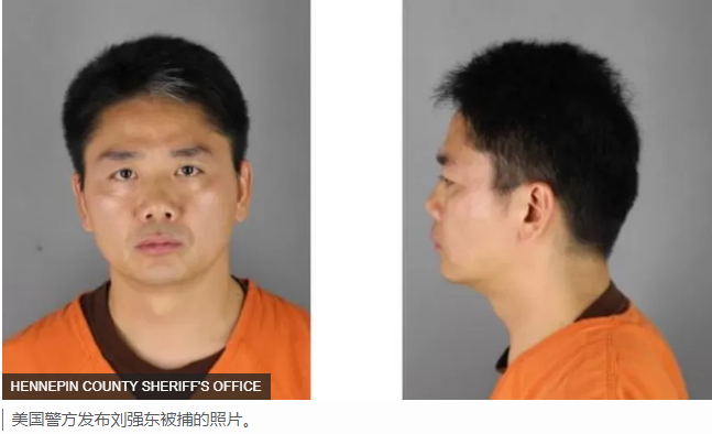 2018年,刘强东被控在美国性侵明尼苏达大学21岁中国女留学生刘静尧,并且流传出一张“遗恨千古”的被捕照。