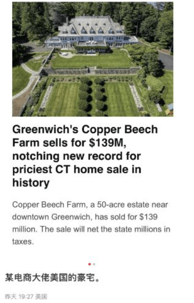 还引用了当地华人的介绍来说明刘强东为什么在这里买房,康州是禁枪州,也是全美最安全的地方之一,虽然同属美国old money家族的后花园,但当地没有纽约长岛那么多的华人。此外,这里离机场很近,适合私人飞机出行。