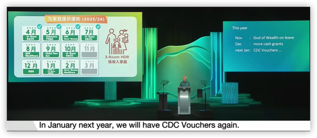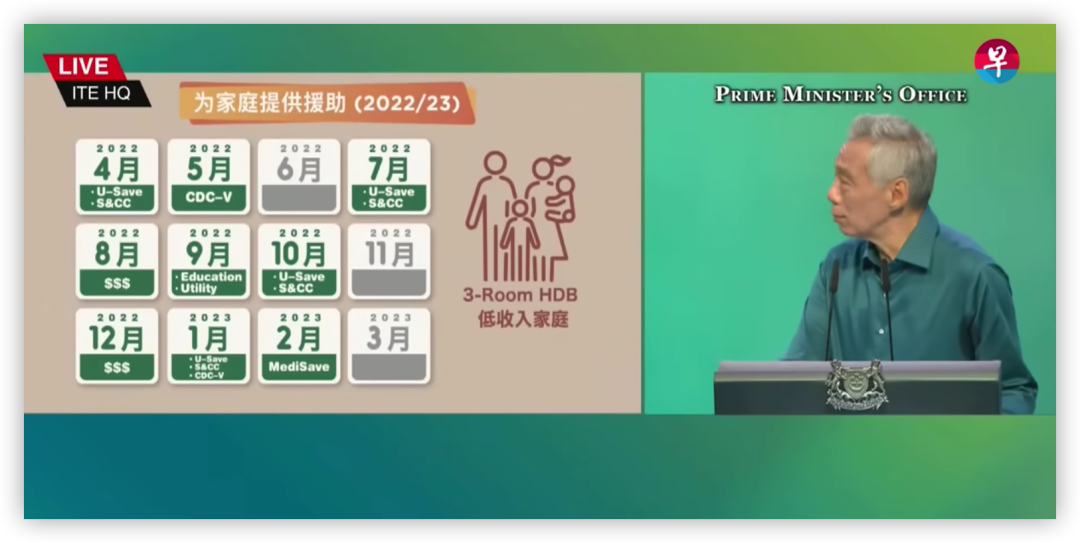 李显龙对着PPT跟大家介绍,过去一年,因为疫情和全球经济增速放缓的影响,政府几乎每个月都会给大家发钱。