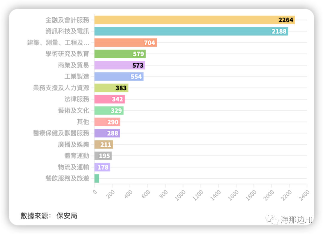 以行业比较,“金融及会计服务”及“资讯科技及电讯”行业历年引入最多专才,分别有2264及2188人,共佔48.5%。