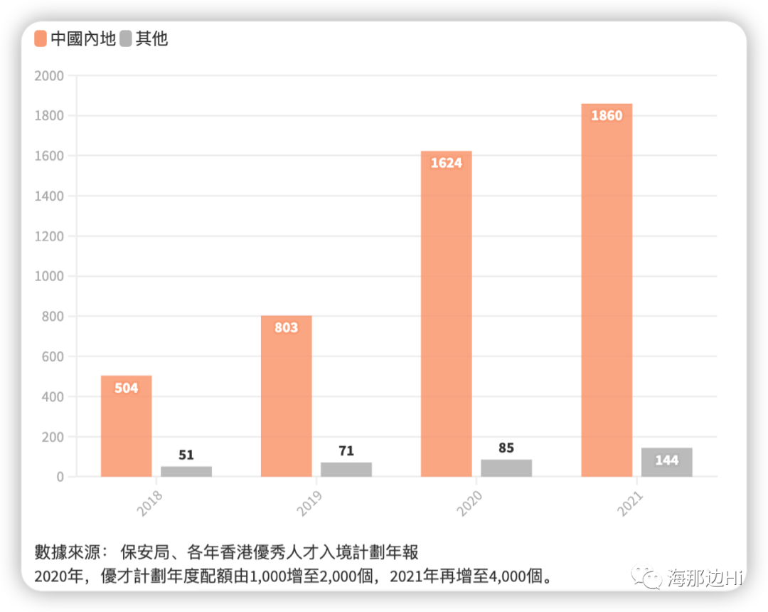 而通过优才计划来港的内地人才,有4成是于近2年配额增加后来港,2020年和21年分别有1624和1860人,较2019年803人多出超过1倍。