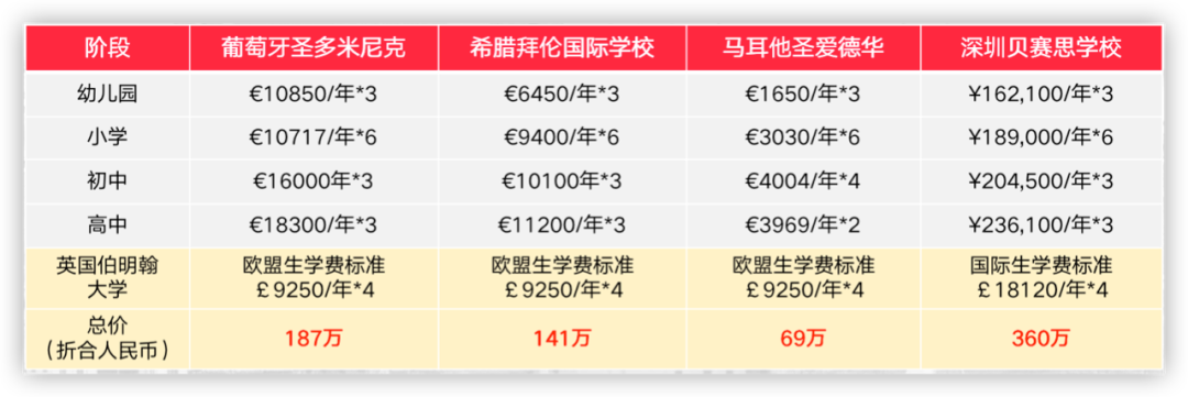在某些方面的物价甚至比国内还要低很多。比如说国际学校的学费。在马耳他读国际学校,费用也比国内要便宜好几倍。可以看看下面这个学费对比,马耳他和其他欧盟国家相比,学费都是最低的。