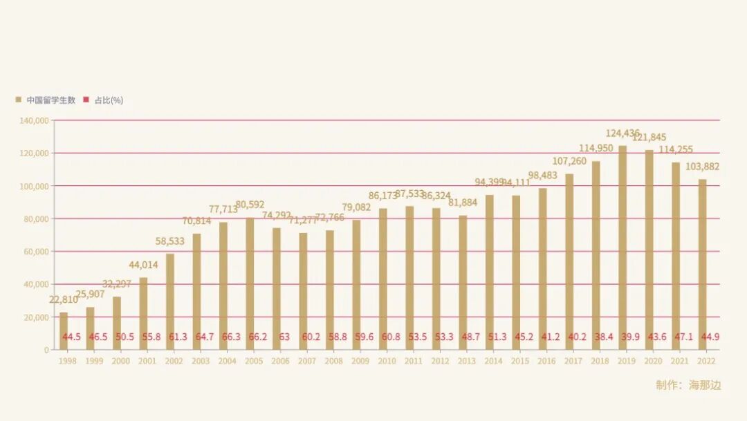 可以看到,从1998年开始,中国留学生的数量比例就占到日本外国留学生的一半左右,一度高达60%以上。而这几十年来,中国和日本不管是“政热经热”还是“政冷经热”抑或是“政冷经冷”,在赴日留学这一块,趋势是很稳定的。