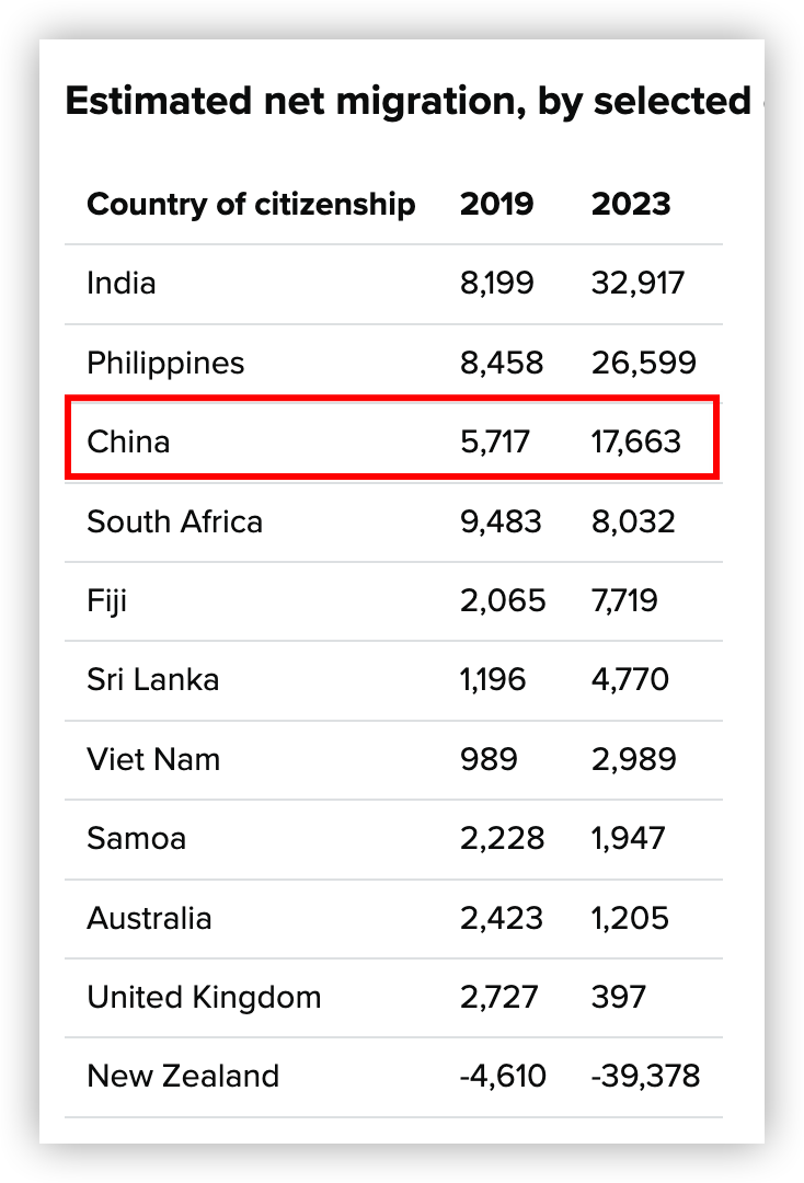 这里的净移民,指的是在新西兰居住12个月以上,移入的人数减去移出的人数所得出。也就是说,2023年中国留在新西兰的移民,比2019年的数量暴增了三倍左右。
