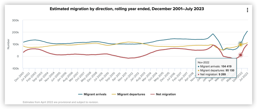 这个趋势一直到2022年11月才由负转正,到2023年7月底,净移民人数刷新了记录。