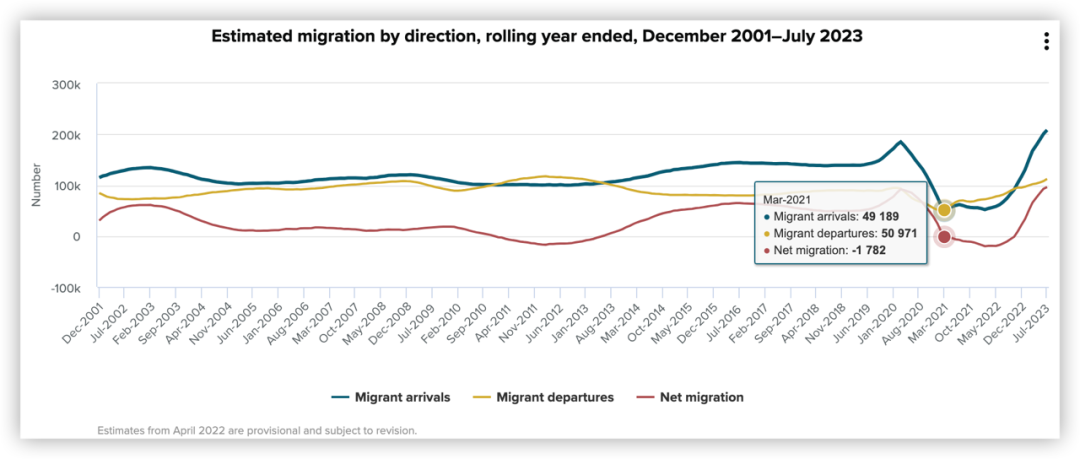 2019年新西兰还没有因为疫情而封锁国境线,真正影响新西兰移民的是从2021年3月开始,可以看到整个新西兰流出的人比流入的人还要多,净移民人数就是负数。