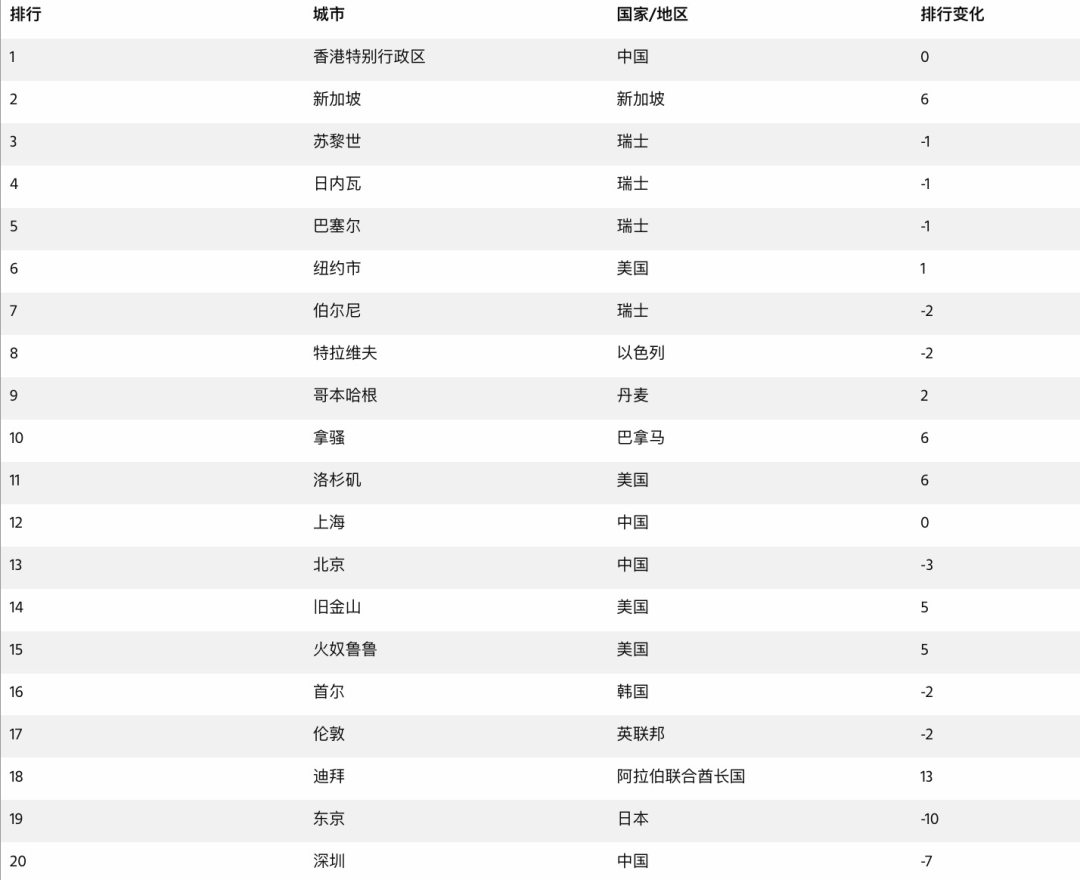 值得注意的是,在排名前20位里,中国内地的城市也占了3席,分别是上海、北京和深圳。