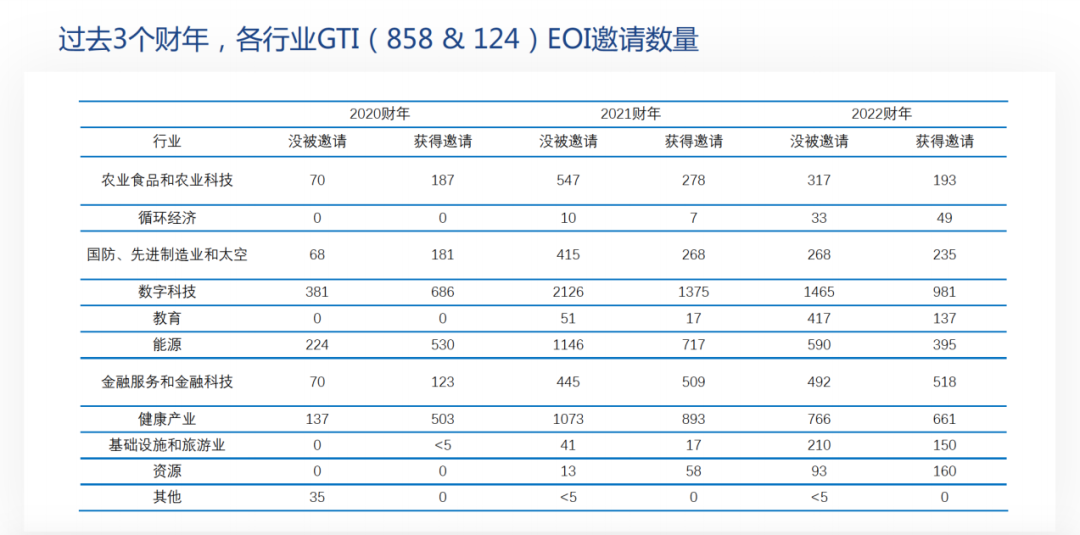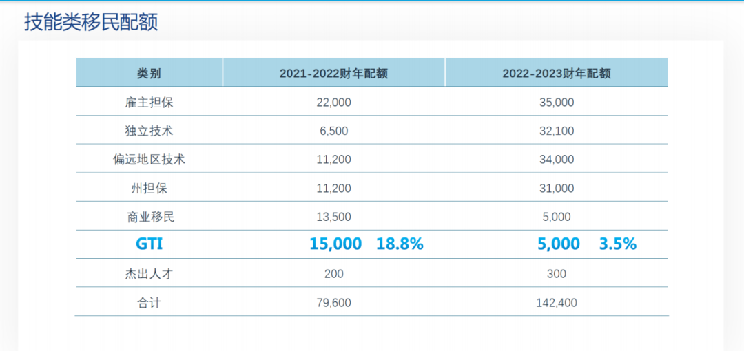 本财年澳洲给到GTI签证的名额是5000个,相比于去年15000个名额,今年的名额缩减了很多。不过需要注意的是,这5000个还包括所有的附属申请人。因为这个签证是可以带着配偶和孩子一起移民的。那这么算下来,其实一年也就能发给大约1700个家庭。