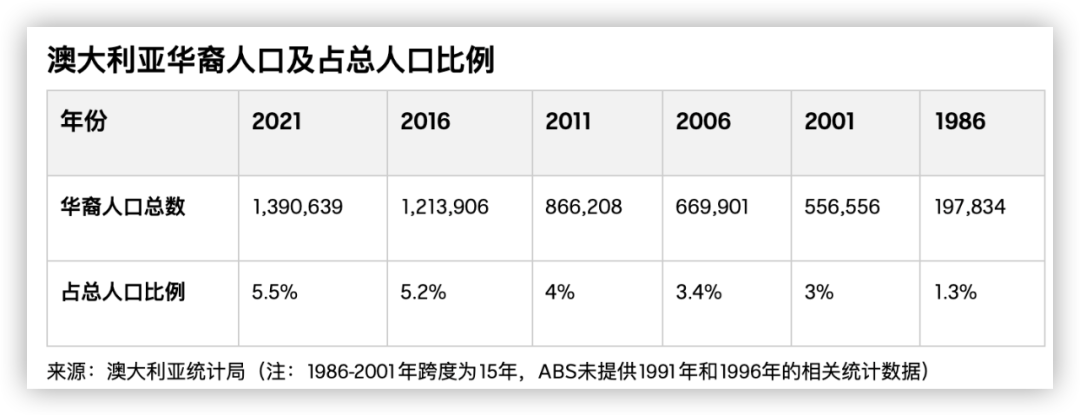在过去35年里,华裔人口增加了五倍多。从1986年人口普查时的不到20万,增加到去年人口普查进行时8月10日的139万多,占澳洲人口总数的5.5%。