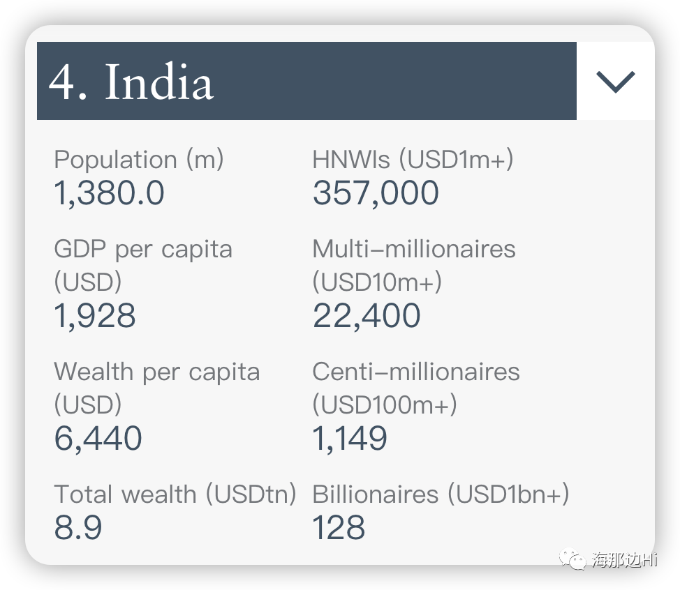 排名第四的是印度,私人财富总值为8.9万亿美元。