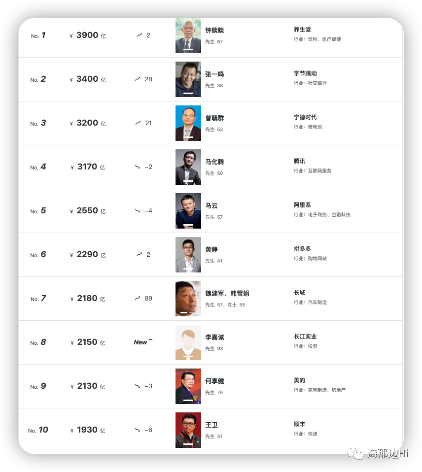 而中国最有钱的10个人,他们的财富分别来源于饮料、医疗保健、互联网、新能源、制造业、投资和快递业。
