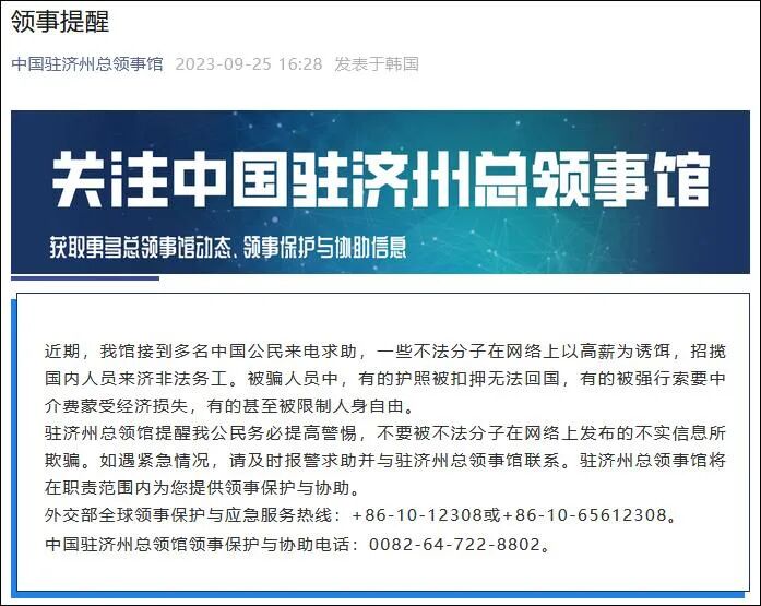 9月25日,中国驻济州岛总领事馆发布“领事提醒”,称最近接到多名中国公民来电求助,一些不法分子在网络上以高薪为诱饵,招揽国内人员来济非法务工。被骗人员中,有的护照被扣押无法回国,有的被强行索要中介费蒙受经济损失,有的甚至被限制人身自由。