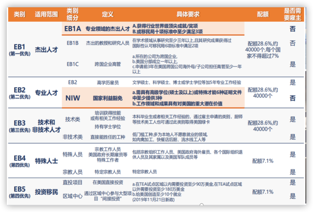 下面这个表把EB1到EB5的定义和具体申请要求都列举了一下,大家看完之后能对美国职业类移民有一个大致的了解。