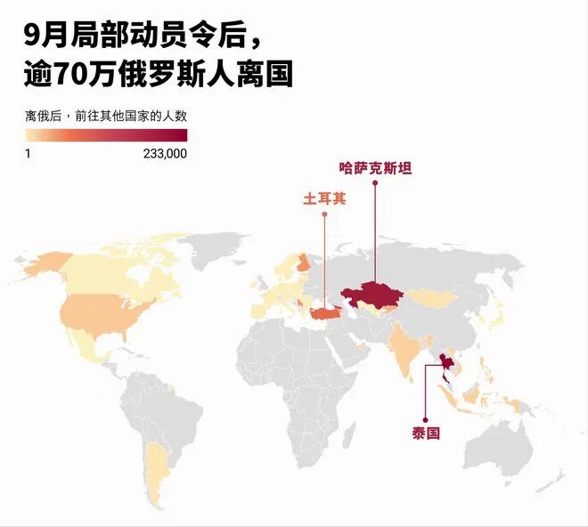 从上面这张图可以看出,俄罗斯人逃往最多的国家是邻近的哈萨克斯坦、土耳其,还有不需要签证的泰国。