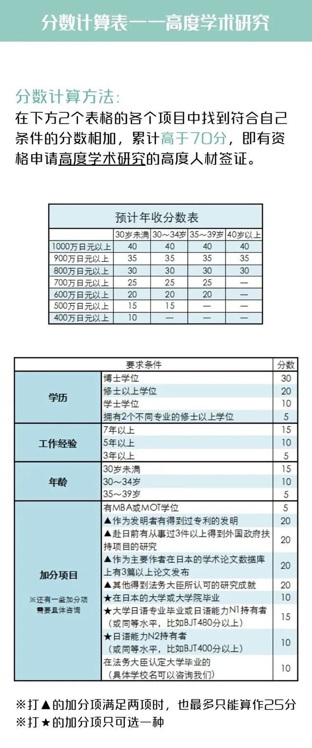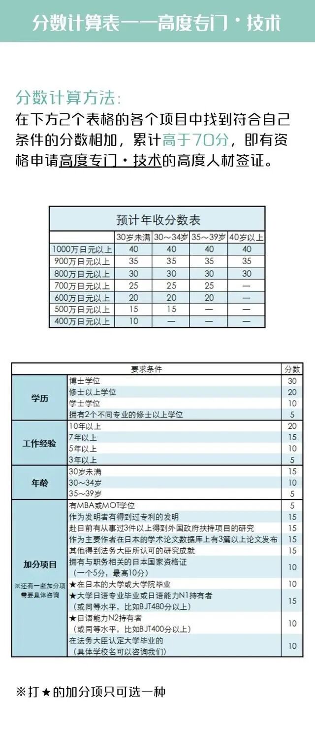 高度人才签证分为三种,分别是“高级学术研究人才”、“高级专业技术人才”、“高级经营管理人才”。 三种人才认定都采取打分制,只要能够达到70分,就算是日本认定的“高级人才”。
