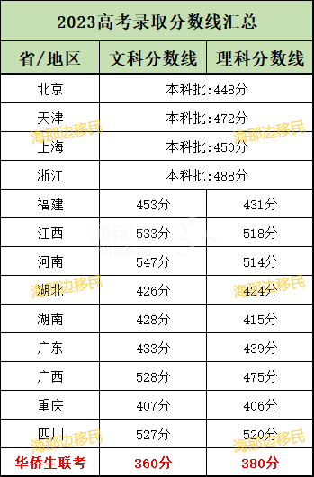 2023年的华侨生联考普通类院校文史类:360分,理工类:380分。而内地高考,各省录取分数线虽然不同,平均在450分左右,只有极少数省份的分数线高达540分以上。