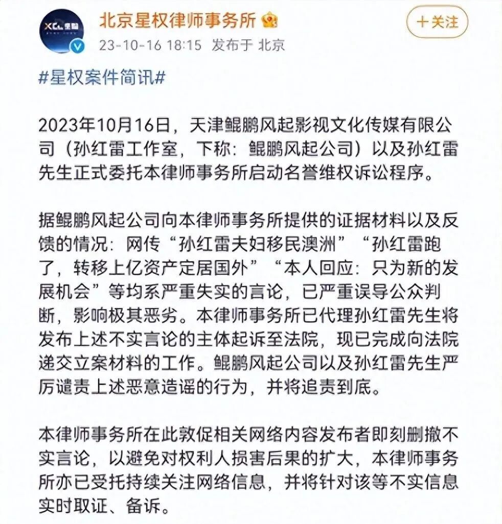 随着话题的发酵,孙红雷的工作室以及委托律师启动名誉维权诉讼程序。