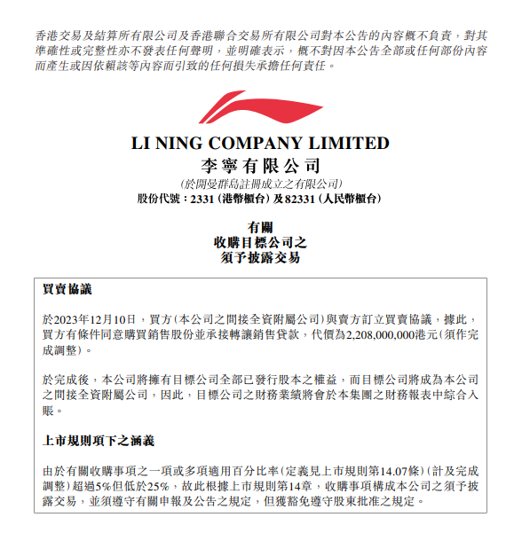 根据港交所12月10日晚上更新的消息,李宁计划以22.04亿港元的价格收购恒基兆业旗下一家主要从事物业投资的公司。