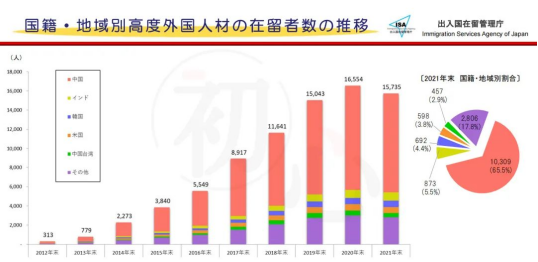 截止2021年,日本高端外国人才有1.7万人,其中中国大陆占比66%。