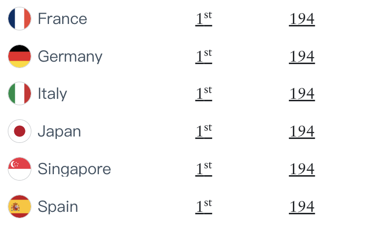 根据世界银行与国际航空运输协会(IATA)数据,亨利护照指数最新榜单发布,其中法国、德国、意大利、西班牙、日本和新加坡这6个国家以免签194个国家和地区,并列全球第一。