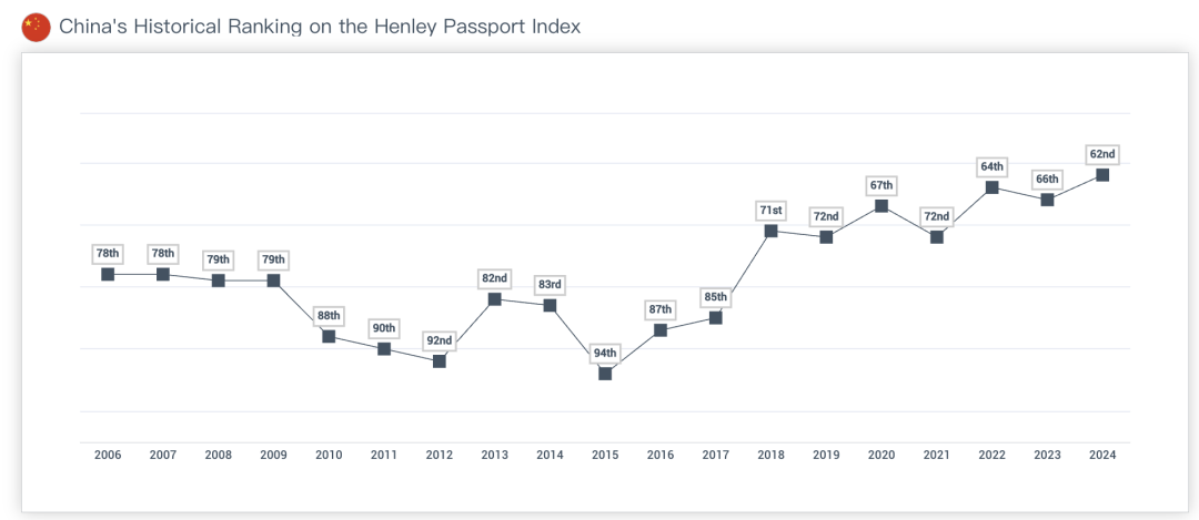 值得关注的是,中国护照以85个免签目的地排名第62,比去年上升了两位,这也是截至目前中国护照取得的最高排名。